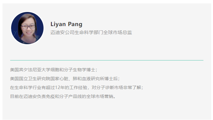 本期分享嘉宾是迈迪安生命科学部门市场总监Liyan Pang,想知道她分享了哪些精彩观点吗?