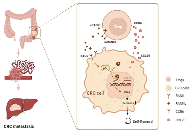 研究人员检查了CRC样本,发现与附近的正常组织相比,CRC组织中的RANKL/RANK升高。较高的RANKL/RANK表达与较差的生存率相关。此外,RANKL主要由调节性T细胞(Tregs)产生,这些T细胞能够促进CRC的进展。RANK的过表达或RANKL的添加显著增加了CRC细胞的干性和迁移性。此外,RANKL/RANK信号转导刺激CRC细胞产生C-C基序趋化因子配体20(CCL20),导致Treg募集并促进肿瘤干性和恶性进展。该募集过程是通过CCL20-CCR6相互作用完成的,证明了CRC细胞和免疫细胞之间的联系。研究发现表明RANKL/RANK在结直肠癌进展中起重要作用,为结直肠癌的预防和治疗提供了潜在的靶点。