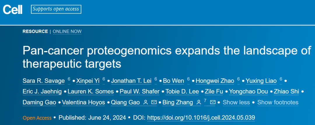 6月24日,复旦大学高强和贝勒医学院章冰共同通讯在期刊《Cell》上在线发表题为“Pan-cancer proteogenomics expands the landscape of therapeutic targets”的研究论文,在这项研究中,研究人员将该数据集与其他公共数据集集成在一起,以阐明癌症治疗的蛋白质靶点。研究分析提供了对现有癌症药物靶点的见解,并系统地确定了药物再利用或开发的候选新靶点。这些包括过表达和过度激活的蛋白质依赖性、与肿瘤抑制基因(TSGs)丢失相关的蛋白质依赖性,以及推定的新抗原和肿瘤相关抗原。